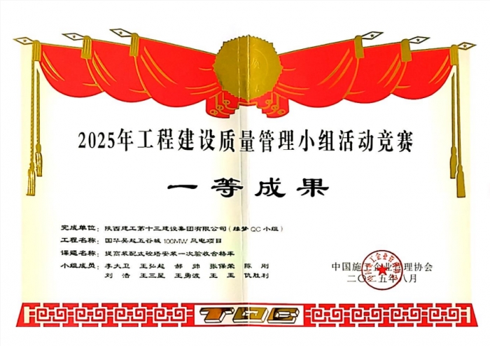 近日,中國施工企業(yè)管理協(xié)會公布了“2025年工程建設(shè)質(zhì)量管理小組成果大賽”獲獎名單,集團(tuán)國華吳起五谷城100MW風(fēng)電項(xiàng)目“緣夢QC小組”參賽成果《提高裝配式砼塔安裝一次驗(yàn)收合格率》獲得大賽一等獎。