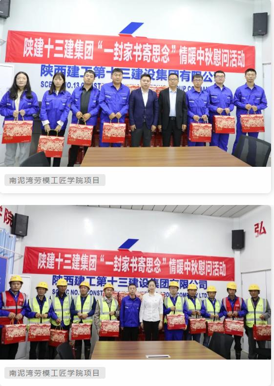 在中秋佳節(jié)來臨之際,9月16日至17日,陜建十三建集團(tuán)黨委、工會分別赴金鴻·行知坊項(xiàng)目、伴山樾谷·芳菲里項(xiàng)目、南泥灣勞模工匠學(xué)院項(xiàng)目施工一線慰問項(xiàng)目管理人員和廣大農(nóng)民工朋友,并為他們送去了月餅及節(jié)日的祝福。